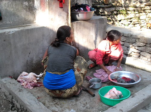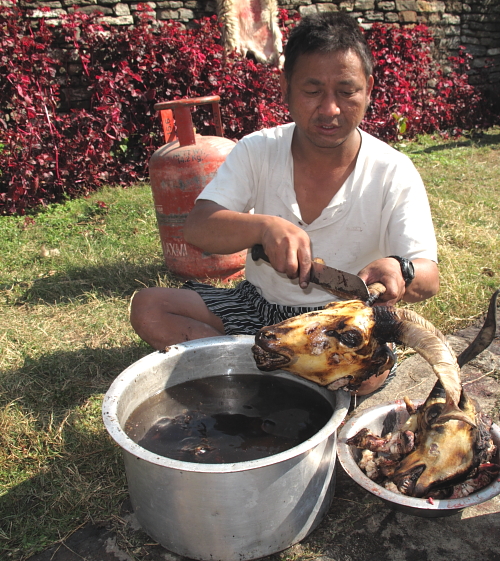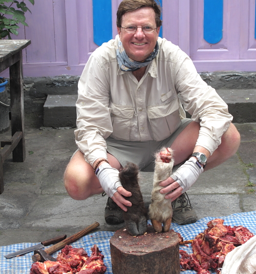 I eat my breakfast alone as my highly competent guide and porter manages the logistics of a sudden and surprising change of plans. Upon his return, we quickly and unceremoniously grab our packs and go outside. We stand for a long minute looking up valley towards Island Peak just as the sun began to touch her flanks. While there I hear: “I will always be here and you are welcome to try and climb me. If you come of “want” you will either reach my top or not…..who cares, it is unimportant. But if you come again of “need“, remember I am insidious, with an insatiable apatite. You may reach my highest point, but it will never be high enough – I will give you a higher mountain, a more precarious sea, a faster motorcycle,….you will never catch me, I can not be caught”. I smile a huge grin, laugh out loud, and give a nod as I turn smartly down hill. “How far down can we get today Angin?” I direct. “You sick sir, but I carry your day pack also, we make dinner – Namche Bazar”. I Okie/Nepalese blow-out – more mucus, more dirt , more blood. We leave.